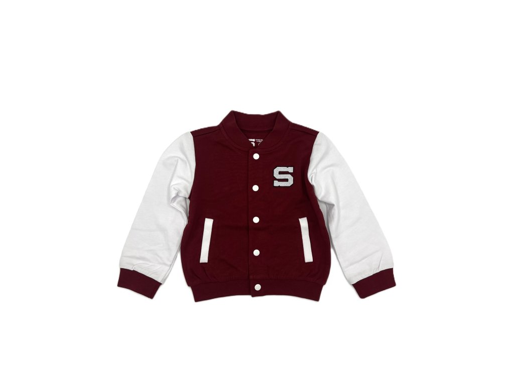 Stylová mikina ve střihu univerzitní bundy pro malé sparťany. Kombinace rudé a bílé barvy, klasické zapínání na patentky a vyšité logo „S“ na levém prsu. Ideální i pro každodenní nošení.