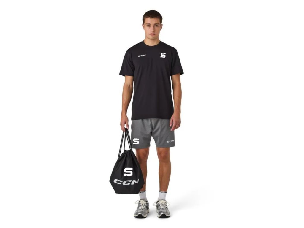 Stylový set obsahuje vše, co potřebuješ - pohodlné sportovní tričko, lehké kraťasy, ponožky a praktický vak na záda s logem CCM.