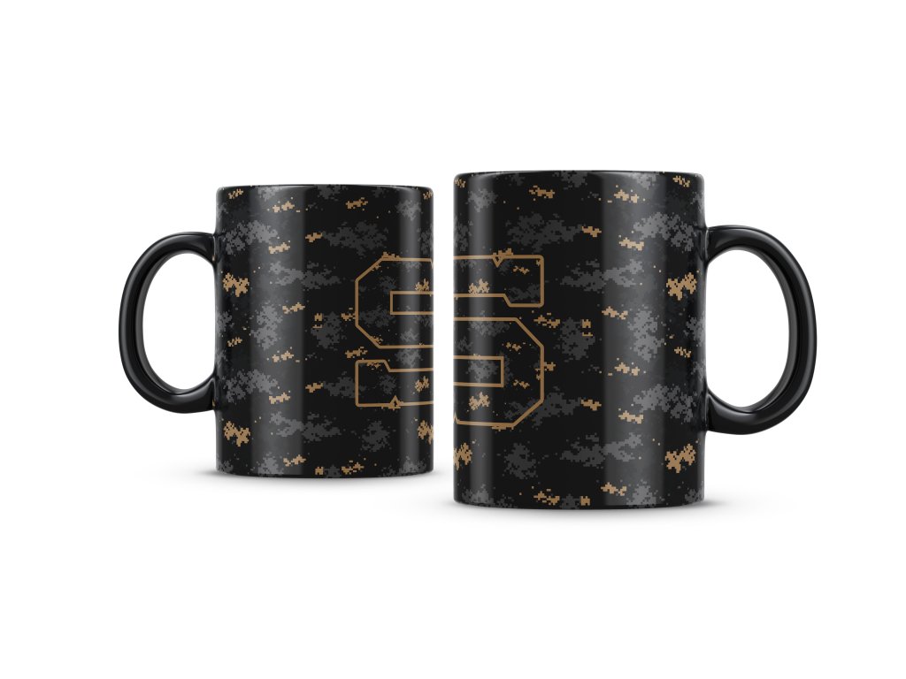 - černý hrnek s camo designem a velkým "S"