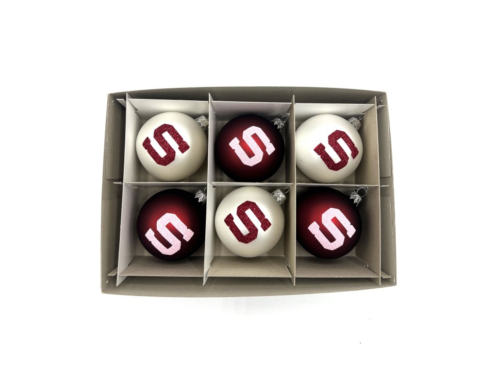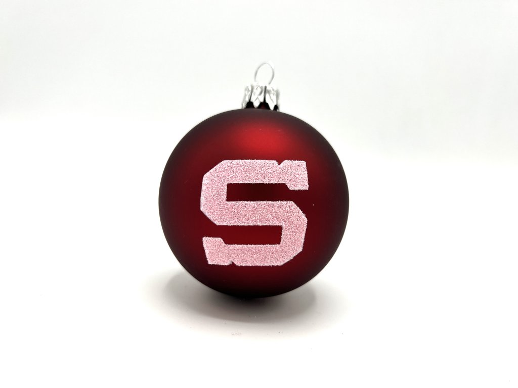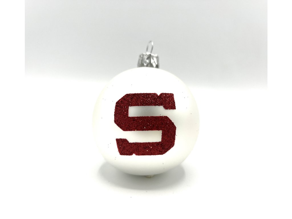 Sadu rudých a bílých vánočních ozdob s logem Sparty.